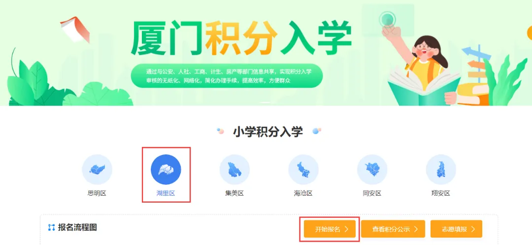 进入页面默认为思明区,请先点选“湖里区”,再点击“开始报名”。