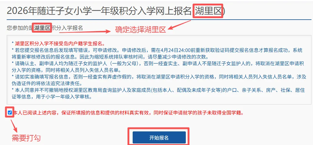 进入“2026年随迁子女小学一年级积分入学网上报名(湖里区)”界面,认真阅读注意事项提醒(蓝色字体部分)。系统默认停留30秒,阅读完勾选下方的方框,确认自己已阅读并同意这些细则,此时下方“开始报名”的按钮由不可点击的灰色变为可以点击的蓝色。点击“开始报名”进入信息登记的界面。