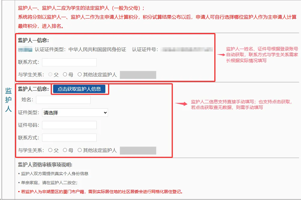 如随迁子女父母双方均在厦暂住、务工、缴交社保则需家长填写正确的监护人二的姓名、身份证号、联系方式等信息。系统支持“点击获取监护人信息”,若查无数据,请手动填写。