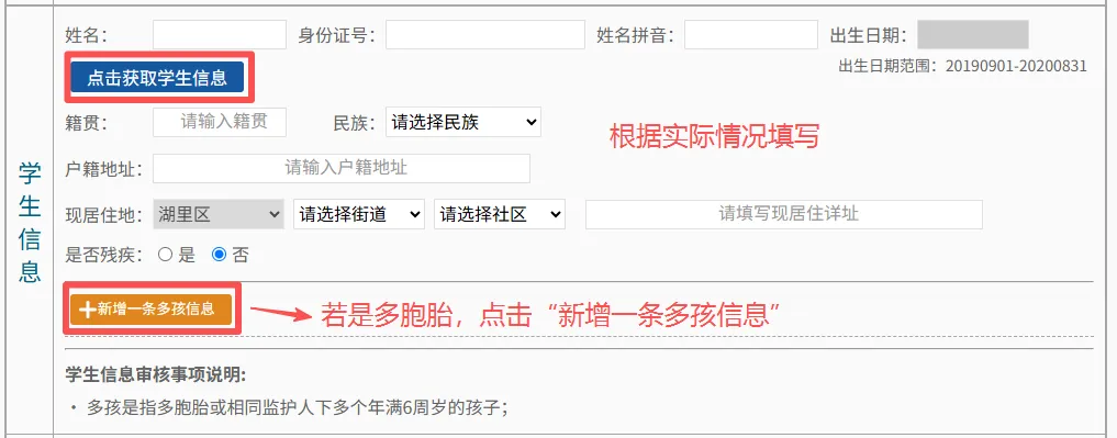 填写学生姓名、身份证号。姓名拼音、出生日期是根据填写的姓名与身份证号自动获取的,无需手动填写。系统支持“点击获取学生信息”调取户籍地址、籍贯等信息,若查无数据,则手动填写,也支持不点击获取直接手动填写。