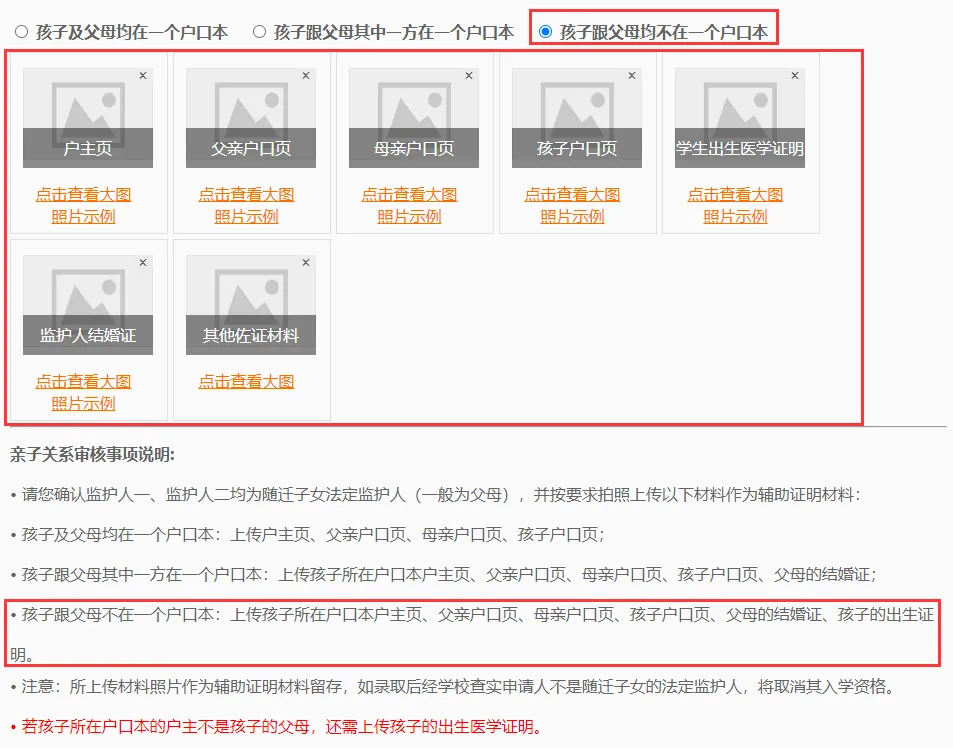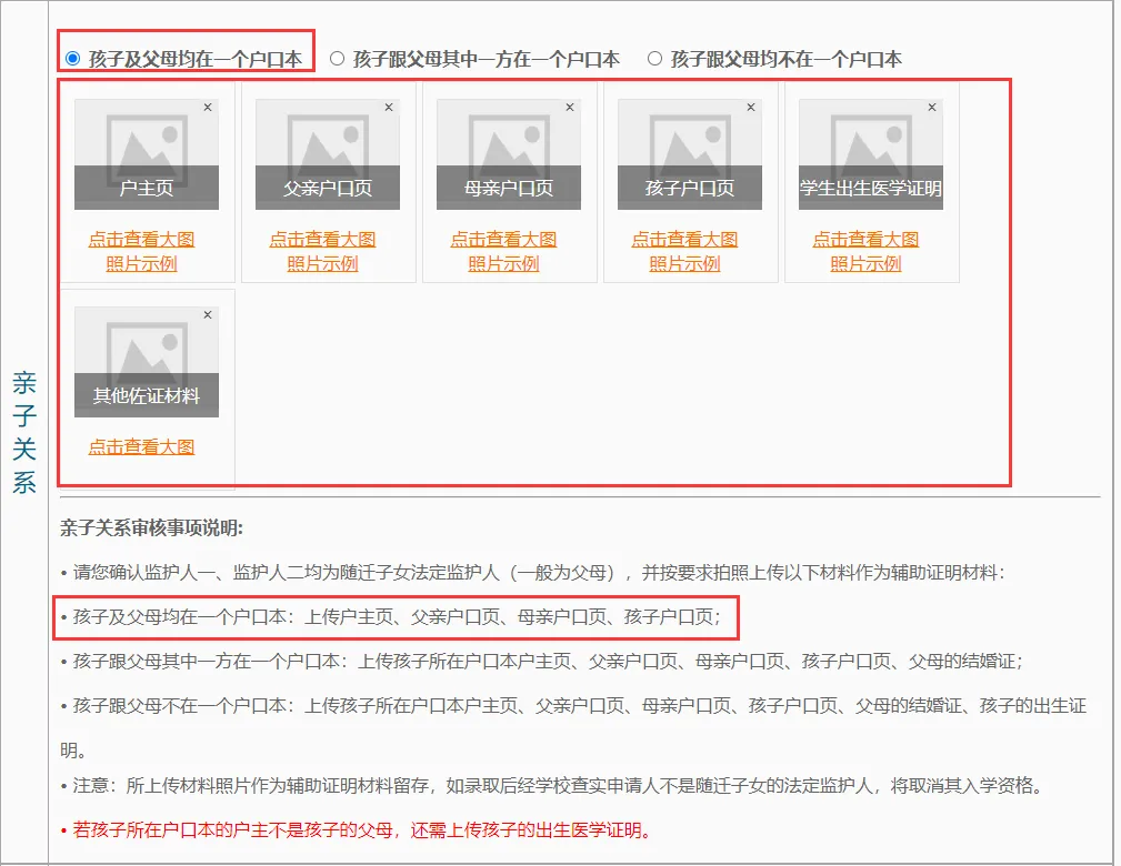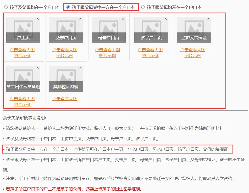 孩子跟父母其中一方在一个户口本,需要上传孩子所在户口本户主页、父亲户口页、母亲户口页、孩子户口页、父母的结婚证。