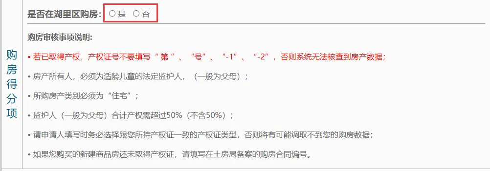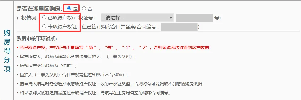 是否在湖里区购房需家长根据自己的实际购房情况点选。如果在湖里区没有购房,点选“否”即可,如果有购房,点选“是”,并根据自己的房产情况填写相对应的房产信息。