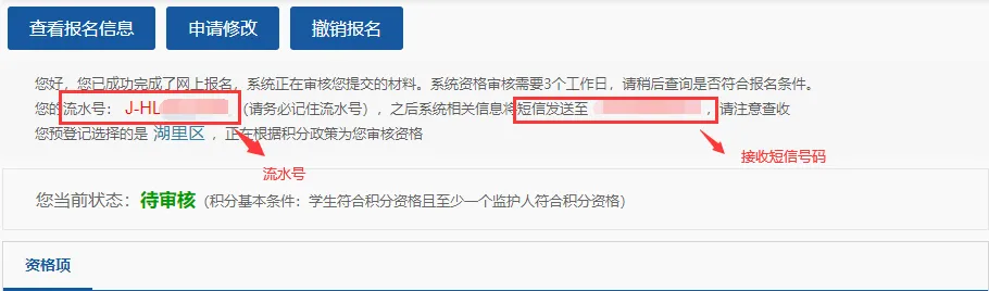 报名信息提交成功后,系统会生成一个唯一的流水号,系统将来到资格审核界面。家长后期可登录系统查看资格审核状态。