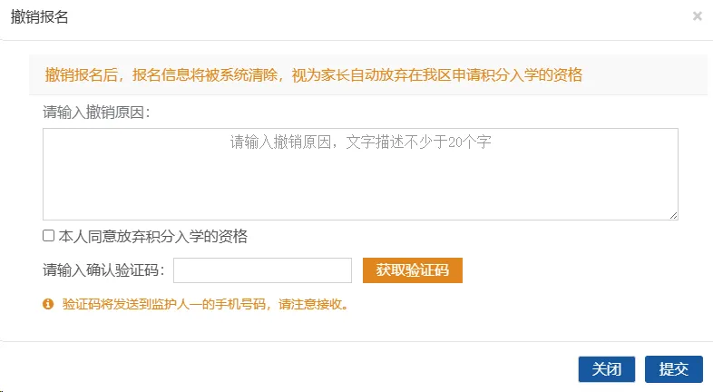 撤销报名需注明撤销原因(原因的文字描述不少于20个字),填写验证码,方可撤销报名。撤销报名后,即为自愿放弃参加我区2026年积分入学。