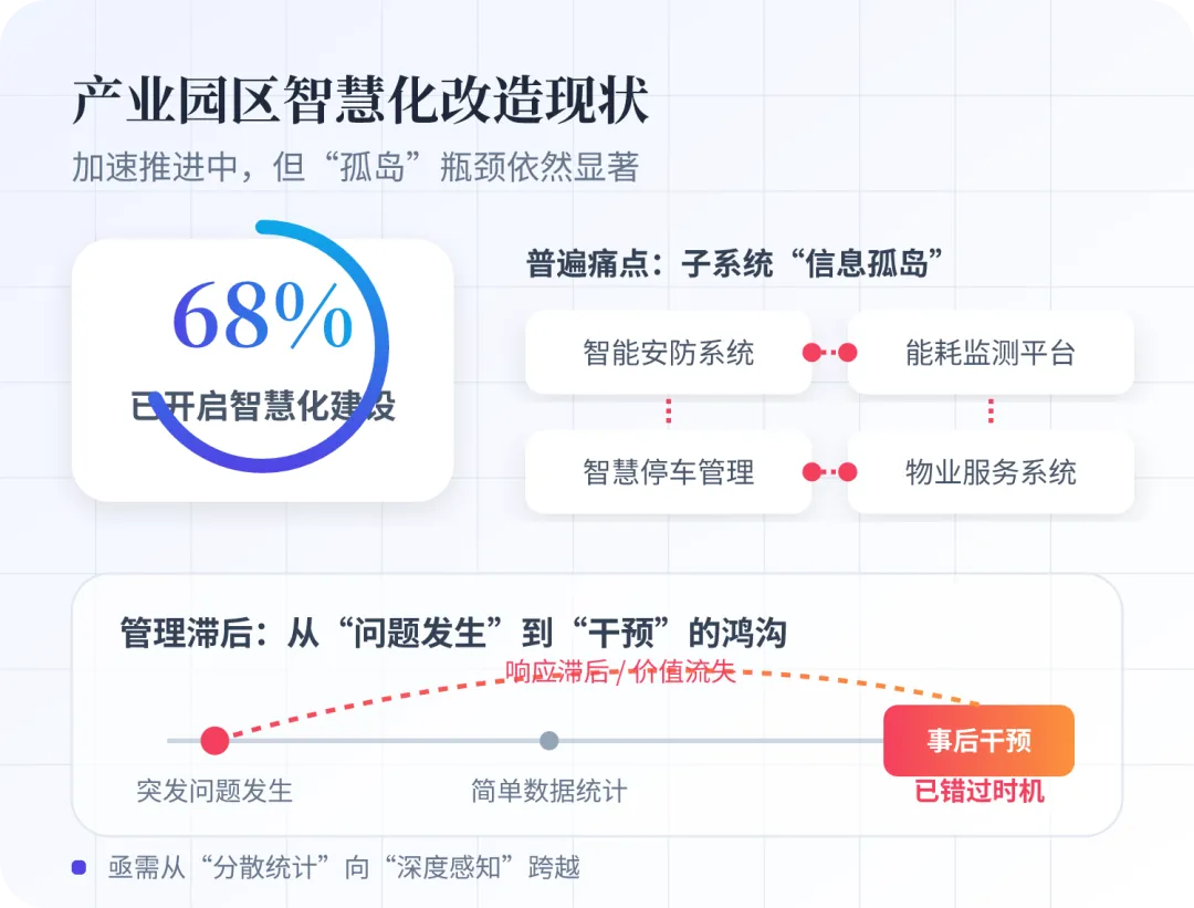 智慧园区|六大AI业务场景之【决策篇】园区管理者必看:还在靠经验决策?数据才是管理的“定海神针”!“以前的园区管理,靠人和纸笔,信息化了也不过是表格和监控拼凑在一起”。超过68%的产业园区正加速推进智慧化改造,但数据分散、响应滞后、管理低效仍是普遍痛点:安防、能耗、停车、物业等子系统独立运行,数据无法互通,形成“信息孤岛”;海量运营数据停留在简单统计层面,无法挖掘潜在价值;管理者只能“事后诸葛亮”,发现问题时已错过最佳干预时机……智慧园区管理系统,以数据中台和智慧驾驶舱为核心,融入AI预测分析与智能决策引擎,打破“信息孤岛”,将分散在各个子系统的海量数据整合、分析、挖掘,打造“一屏尽览、智能预警、科学决策”的管理模式,让园区管理从“经验驱动”彻底转向“数据驱动”,助力管理者精准把控运营全局,抢占智慧园区发展先机!对于园区管理者而言,“看不见、算不清、决策难”是最大的痛点。传统园区管理中,各业务子系统独立运行,数据无法互通共享,导致管理决策缺乏科学支撑,陷入三大困境:困境一:“信息孤岛”难打破安防、能耗、物业、招商、合同等子系统各自为战,数据分散在不同平台,没有统一的整合与分析渠道。管理者想要了解园区整体运营情况,需要逐一登录各个系统、汇总各类报表,耗时费力,还容易出现数据偏差,无法快速掌握园区真实运营状态。困境二:数据价值难挖掘园区日常运营会产生海量数据,比如能耗数据、工单数据、招商数据、企业经营数据等,但这些数据大多停留在简单统计层面,仅用于记录和存档,无法通过分析挖掘其潜在价值。管理者无法从数据中发现运营短板、预判发展趋势,决策只能依赖个人经验,缺乏科学性。困境三:决策响应滞后传统管理模式下,数据统计、分析需要人工完成,周期长、效率低,等管理者发现问题(如能耗异常、房源空置率上升)时,往往已经造成了经济损失,无法实现“事前预警、事中干预”,只能被动应对,陷入“事后补救”的被动局面。AI破局:构建“数据中台+智慧驾驶舱”,让决策更智能、更高效智慧园区管理系统打破传统管理的局限,以数据中台为核心整合全量数据,以智慧驾驶舱为载体实现数据可视化,以AI预测分析为支撑实现智能决策,构建“数据采集—整合—分析—决策—执行”的全闭环管理体系,让园区管理“一屏尽览、心中有数”。核心能力一:数据中台——打破“信息孤岛”,实现全量数据统一管理数据中台作为园区数据的“中央枢纽”,整合了招商、合同、能源、物业、企业服务等六大业务场景的全量数据,实现“一次采集、多方复用”,彻底打破各子系统之间的“信息壁垒”。系统通过网络爬虫、API接口、物联网传感器等多种方式,实时采集园区各类数据,包括企业信息、能耗数据、工单数据、合同数据、安防数据等,经数据清洗、脱敏、治理后,建立统一的数据标准和指标体系,确保数据的准确性、完整性和一致性。无论是招商线索数据、合同履约数据,还是能耗监测数据、物业工单数据,都能在数据中台实现集中管理,管理者无需再逐一登录各个系统,即可快速调取所需数据,为决策提供全面、精准的数据支撑。同时,数据中台支持数据多场景复用,可根据不同管理需求,生成各类分析报表,满足招商、运营、管理等多岗位的决策需求。核心能力二:智慧驾驶舱——一屏尽览园区运营,状态实时可视智慧驾驶舱是园区管理的“指挥中心”,采用可视化技术,将数据中台的全量数据以图表、热力图、仪表盘等形式,直观呈现在一个屏幕上,实现园区运营状态“一屏尽览、实时监控”。驾驶舱支持自定义配置,可根据管理者的岗位需求,展示核心运营指标,涵盖招商、合同、能源、物业、企业服务等六大场景,让管理者快速掌握园区整体运营情况。比如,招商板块可实时展示线索转化率、房源出租率、待租面积等核心指标;能源板块可直观呈现各区域能耗数据、能耗异常预警;物业板块可实时查看工单处理进度、设备运行状态;企业服务板块可展示企业诉求响应情况、企业留存率等。同时,驾驶舱支持钻取查询,点击某一指标,即可查看详细数据,快速定位问题根源,让管理更精准、更高效。核心能力三:AI预测与智能决策——从“事后补救”到“事前预判”AI技术的融入让数据中台具备预测与智能决策能力,推动园区从“被动响应”向“主动优化”转型。系统部署AI预测分析模型,基于历史数据和实时数据,对园区运营趋势进行精准预测,包括能耗预测、房源出租率预测、企业留存率预测等,提前预判可能出现的问题,为管理者提供决策建议。例如,AI能耗预测模型可提前7天预测园区未来能耗趋势,若预测到某时段能耗将超标,系统会自动生成节能调控建议,指导管理人员调整空调、照明等设备运行状态,实现节能降耗;AI招商预测模型可根据历史招商数据,预测不同产业赛道的招商潜力,为招商方向调整提供数据支撑。同时,智能决策引擎将服务颗粒度从“楼宇级”细化到“工位级”,结合实时数据与历史数据,生成照明、空调等设备调节策略、招商优化方案等,让决策更科学、更精准。智慧园区管理系统的决策能力,依托于“数据中台+智慧驾驶舱+AI预测模型”的核心技术架构,采用云原生设计,确保系统稳定、高效、可扩展:- 数据中台:采用Hadoop生态系