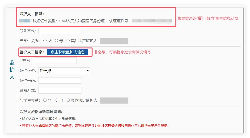 监护人一:系统自动获取家长“厦门i教育”公安实名注册的账号信息,核实确认并完善其他信息。