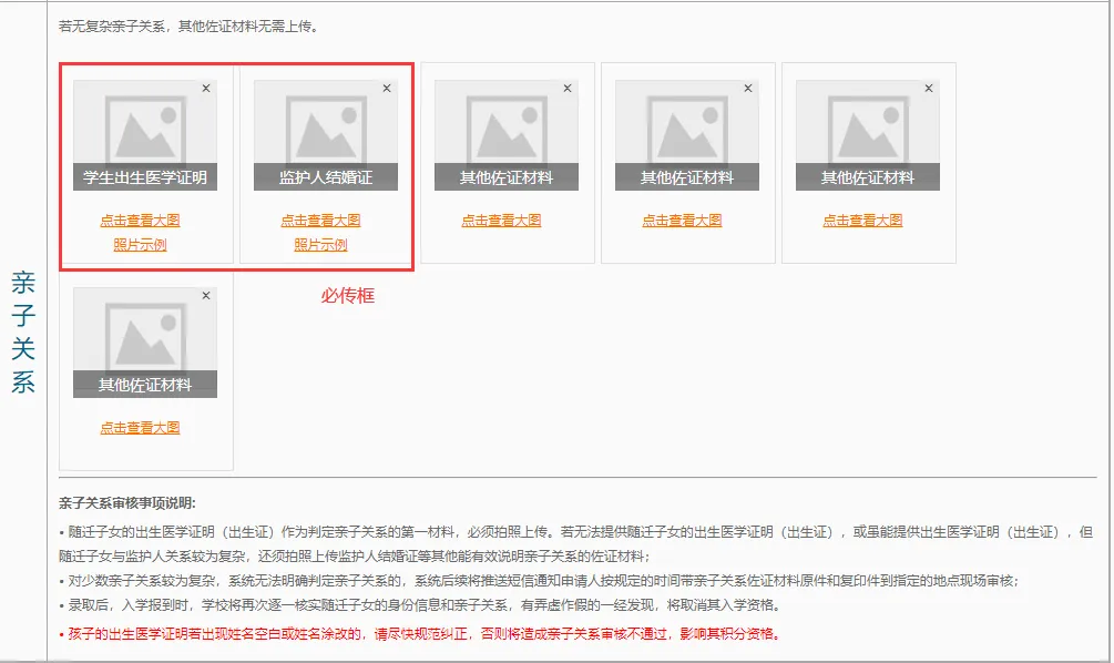 ②标有“学生出生医学证明”及“监护人结婚证”的方框为必传框。若无对应证明材料,也请在此框上传其他亲子关系证明材料替代。