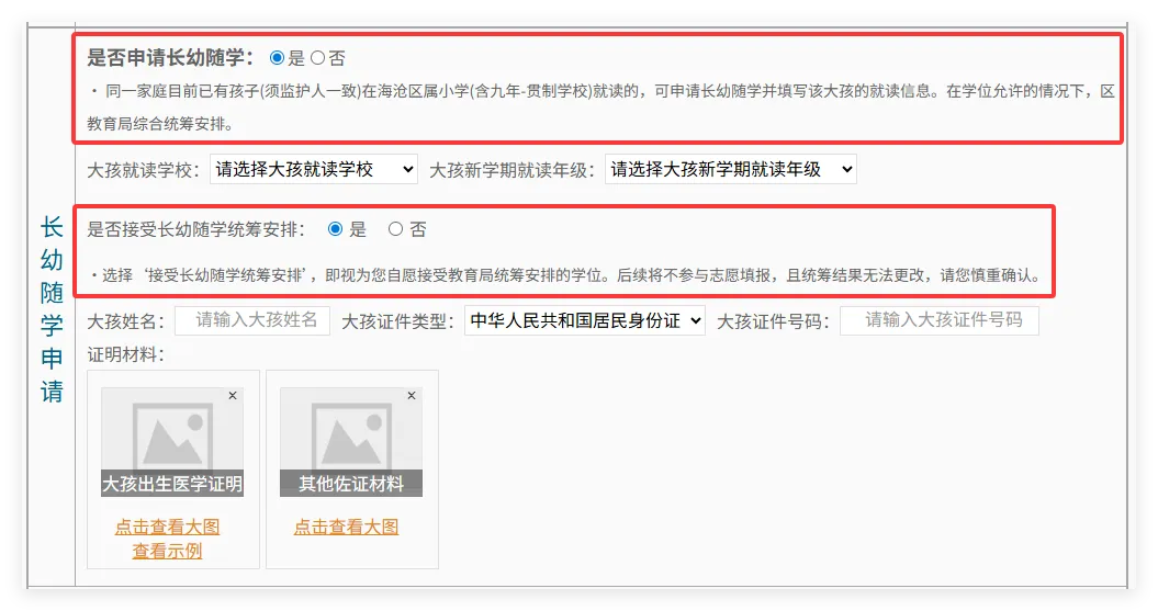 ①如果在【大孩就读学校】的选项中没有您大孩就读的学校,表示该所学校不试行长幼随学,无法申请长幼随学,【是否申请长幼随学】请选择“否”。