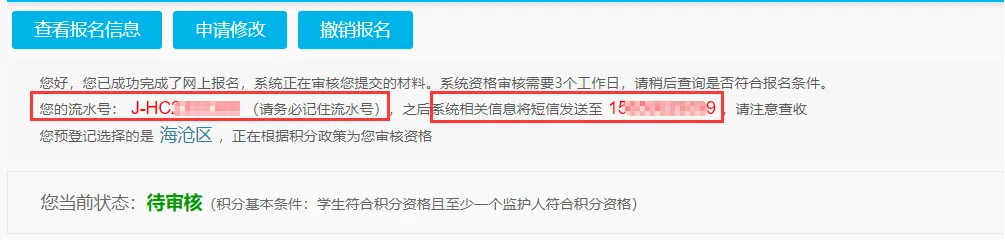 报名信息提交成功后,页面将跳转到资格审核界面,系统会生成一个报名流水号,家长后续可登录系统查看资格审核结果。