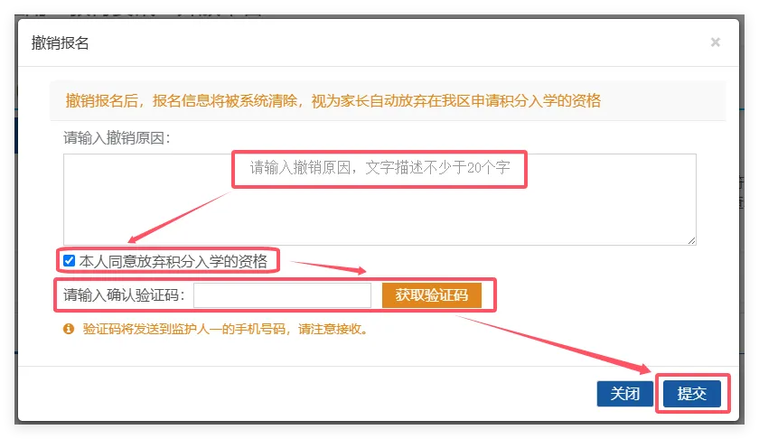 ①验证码将发送到“监护人一的手机号码”,请注意查收。