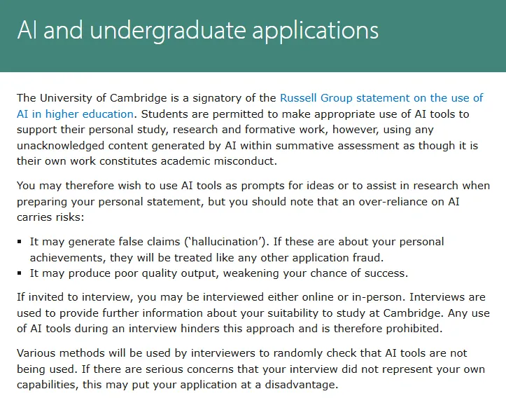 剑桥大学本科申请官网有一个专门页面,标题就叫 “AI and undergraduate applications”。里面说得非常明确:学生可以适当地使用 AI 工具来支持个人学习、研究和形成性作业;但如果在正式考试评估中,把未经说明的 AI 生成内容当作自己的作品提交,就构成学术不端。
