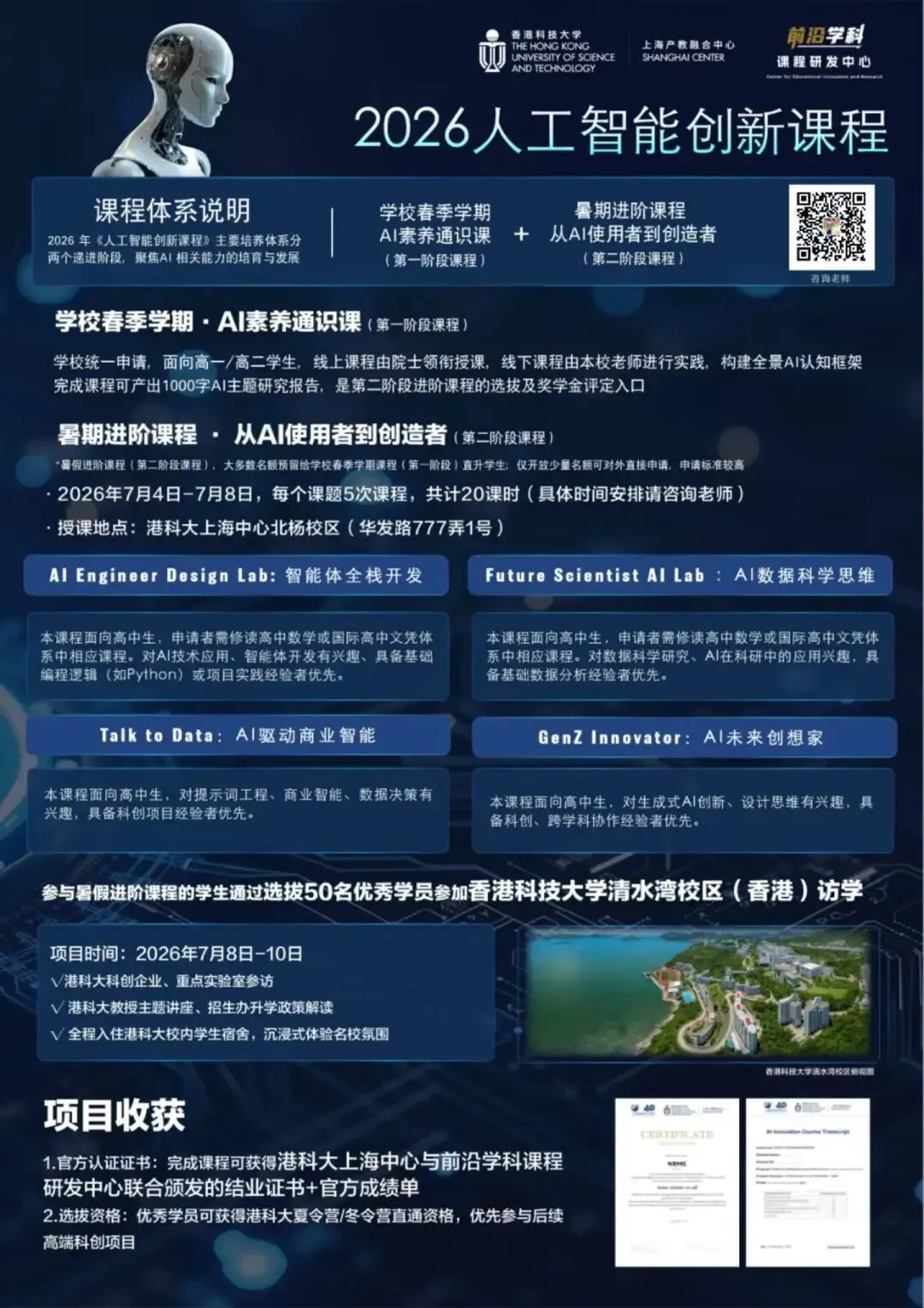 港科大2026人工智能创新课程,面向中学阶段学生,由院士领衔线上授课,线下于港科大上海中心北杨校区实践,四大方向任选——覆盖工程、科研、商业与创新。