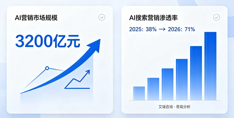 中国 AI 营销市场规模已突破 3200 亿元,AI 搜索营销渗透率从 2025 年的 38% 飙升至 71%。这意味着:每 10 家企业,就有 7 家正在用 AI 重构营销体系。未布局 AI 的企业,有效触达率比同行低 47%,无效曝光高 58%,流量流失风险成倍加剧。