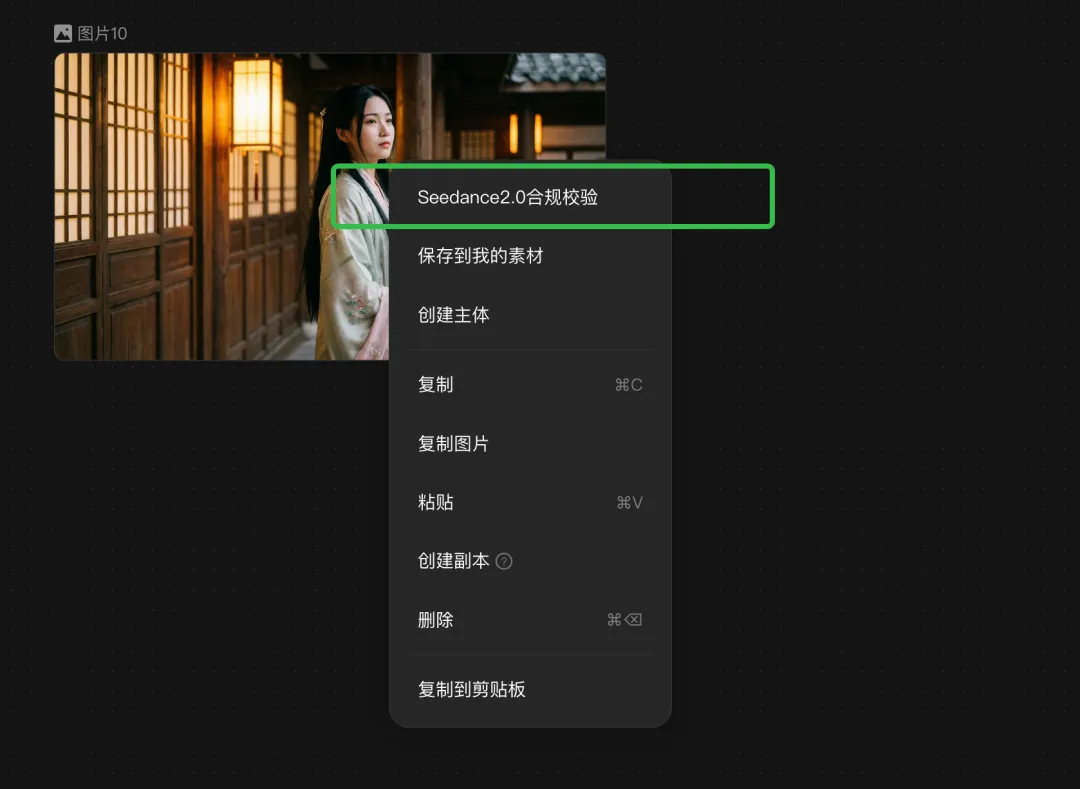 比如开头的古风真人女性图片,只需要将图片、视频、音频资源上传至LibTV画布,右键进行合规检验,出现通过角标之后就可以生成视频,角色也可以直接添加至角色库中。
