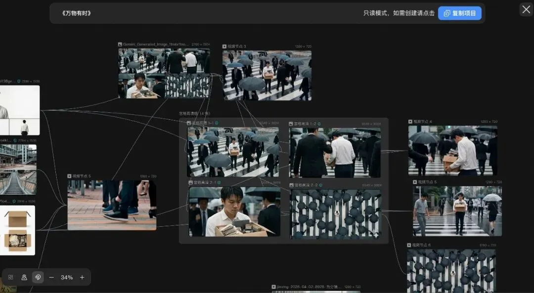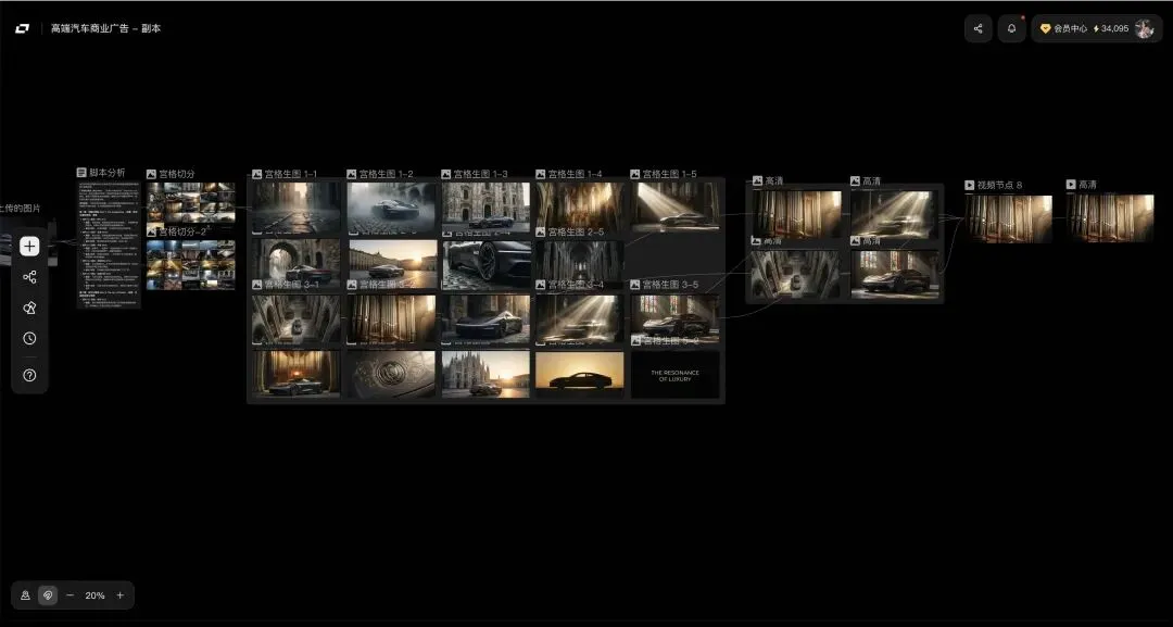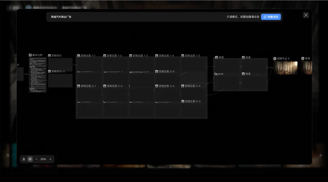 此后,无论是承接另一个品牌的同类型广告,还是打造同系列短视频栏目,你只需要打开这个模板,替换核心的文案和参考图,整条流水线便能自动运转,产出风格、节奏、画质都高度一致的成片。