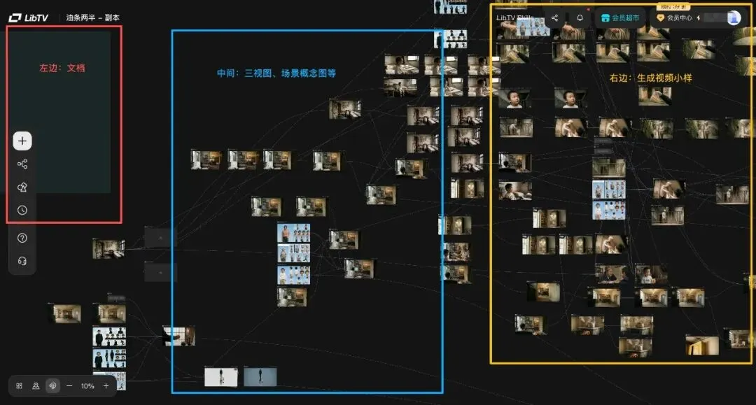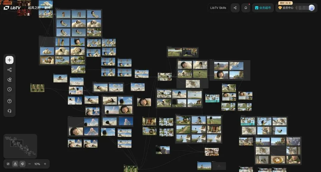 打开LibTV,你看到的不是传统的文生图、图生视频时间线,而是一块可以无限缩放和延展的画布。