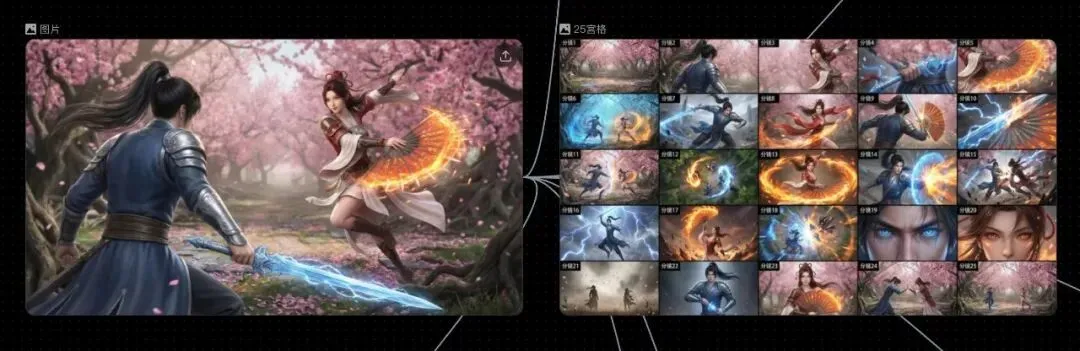 还有LibTV独家的多机位9/25宫格切分,选择画面进行3秒后&5秒后的视频推演,高效率选择你想要的画面效果。