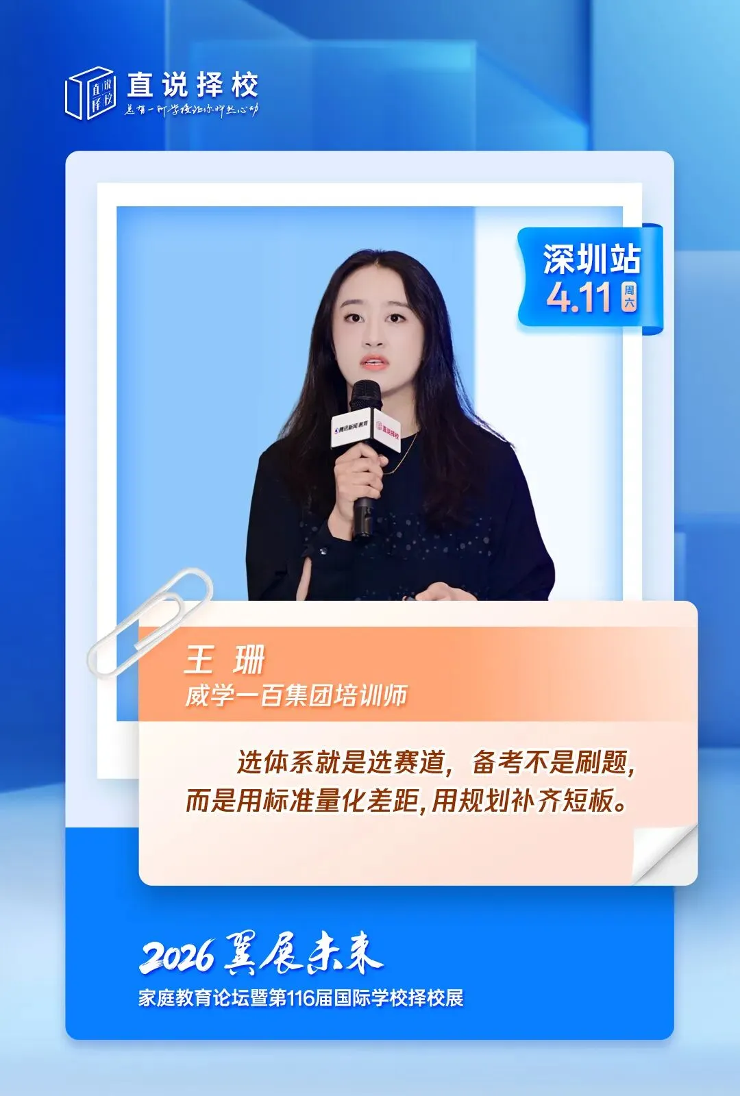 威学一百集团培训师王珊在演讲中,详细拆解了深圳头部国际学校的入学核心要点。