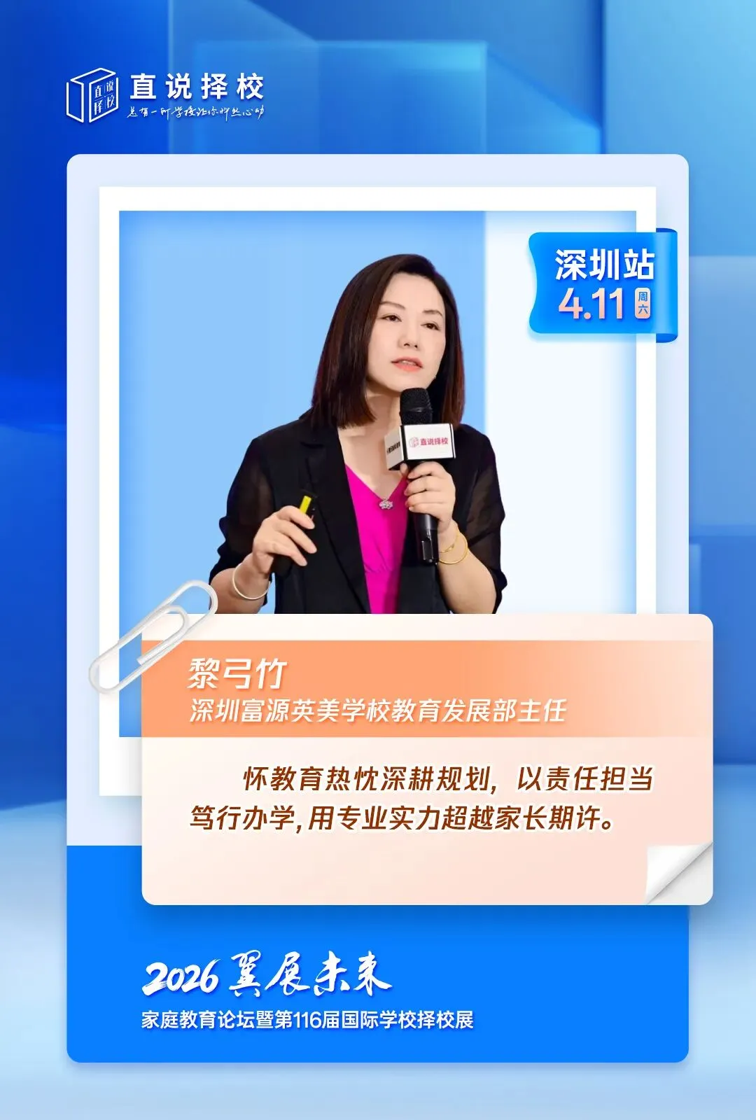 深圳富源英美学校教育发展部主任黎弓竹结合 20 余年国际教育从业经验,分享择校干货并介绍学校。该校有 24 年办学历史,获剑桥、爱德思双授权,开设 A-Level、AIP 艺术、香港 DSE 等课程,连续 8 年入选胡润百学全国国际化学校百强。