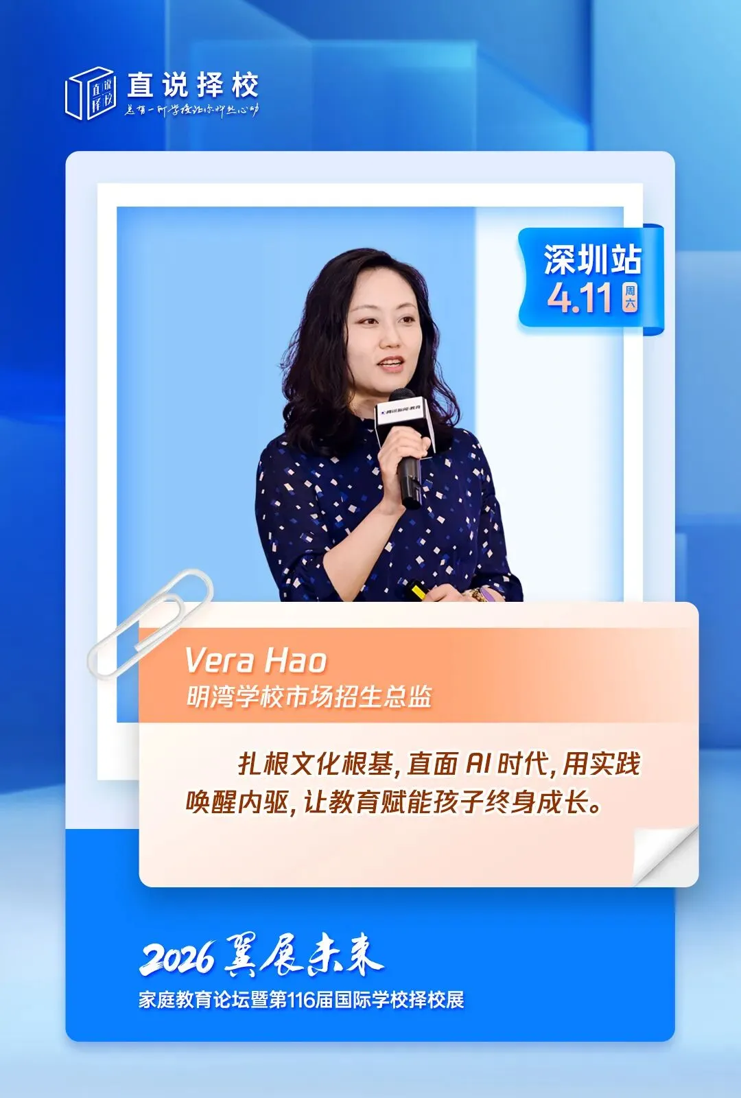 明湾学校市场招生总监Vera Hao的演讲聚焦当下教育两大核心挑战:一是 AI 时代下,甲骨文、亚马逊等企业基础岗位被高效替代,优秀大学毕业生的初阶职场路径或受冲击;二是部分孩子因生活优渥,缺乏奋斗目标与学习动力,生命意义感亟待构建。