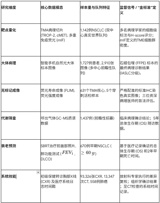 综上(详见表1),当前胸部肿瘤AI研究的核心数据模态与监督信号体系,正在经历从单一形态学,向功能学、代谢学及系统级工作流指标多维演进的过程。