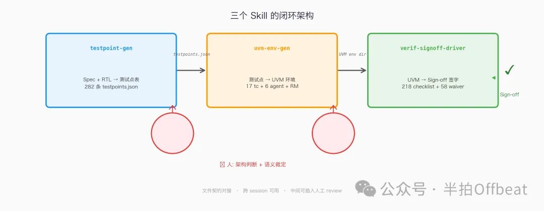第一,三个 skill 串联证明了 agent 闭环能在芯片验证里端到端跑通。从 spec 读取到 sign-off 签字,不是 demo,是一个能复用的流水线。UVM 20 年积累的方法论不是 AI 时代的负债,是工业底座。