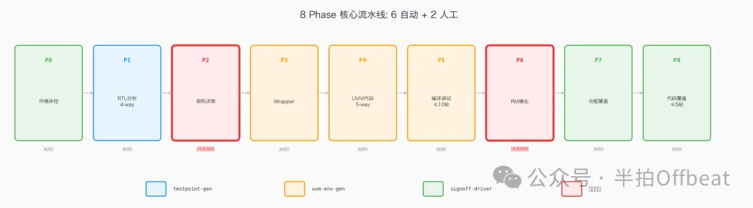 8 Phase 闭环:6 自动 + 2 人工