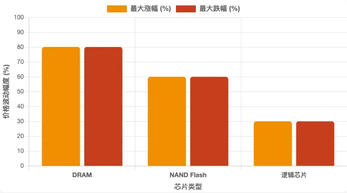 📊 DRAM价格波动最剧烈,最大涨幅可达80%,最大跌幅同样可达80%。NAND次之,逻辑芯片波动最小。