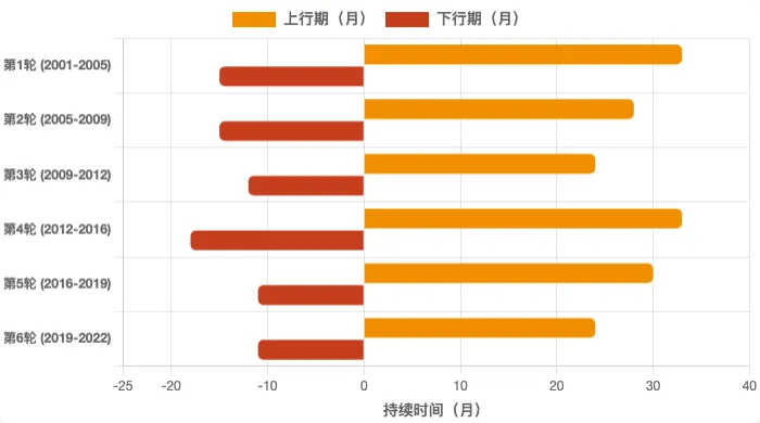 📊 6轮完整周期对比,上行期平均28个月(绿色),下行期平均13个月(红色)。每轮周期总时长约4年