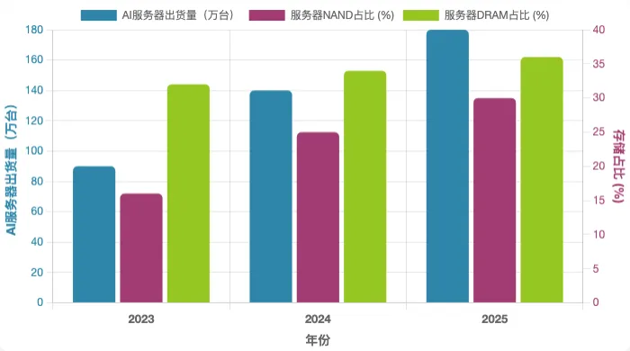 📈 AI服务器出货量2024年达140万台(+56%),2025年预计180万台。服务器存储占比大幅提升——NAND从16%升至30%,DRAM从32%升至36%。