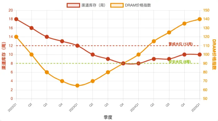 📈 库存水位与价格呈明显反向关系。2022Q1库存高达18周,价格持续下跌;2023Q4库存降至8周安全水位,价格开始回升。红色虚线为警戒水位(12周),绿色虚线为安全水位(8周)。