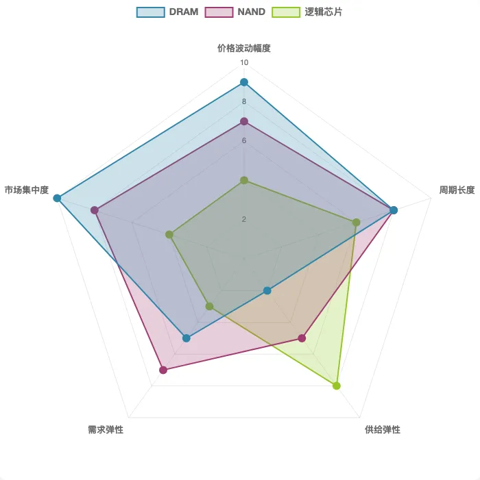 📊 雷达图展示DRAM、NAND、逻辑芯片在五个维度的对比。DRAM在价格波动、市场集中度上得分最高,但供给弹性最低。逻辑芯片则相反。
