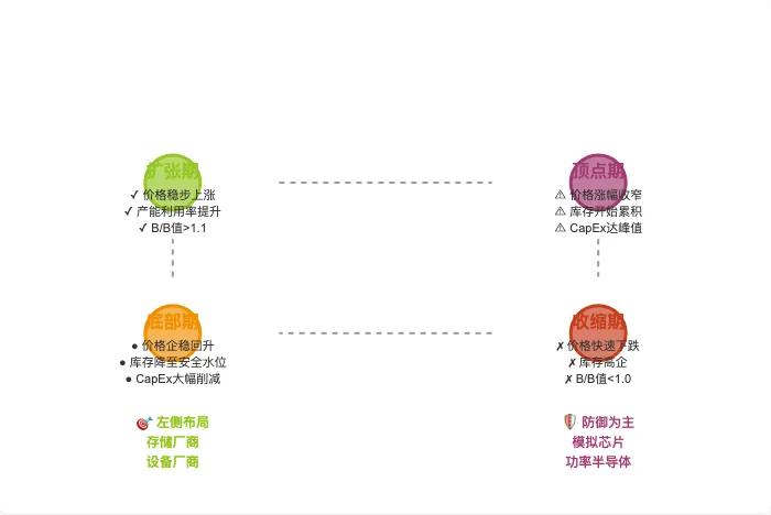 📊 投资策略决策框架。扩张期→左侧布局,存储/设备厂商;顶点期→及时撤退,转向防御性标的;收缩期→防御为主,模拟/功率芯片;底部期→左侧布局时机。