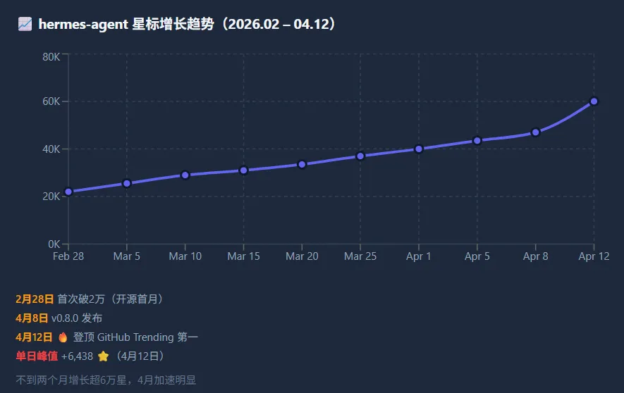 Claw123翻出两个月前的数据对比:hermes-agent在2月底开源首月突破2.2万星,4月8日v0.8.0版本发布后单日新增6400+星,不到两个月总星标突破4.7万。而4月12日当天,hermes-agent单日新增6438星、累计60045星的战绩,直接让榜单第二名望尘莫及。
