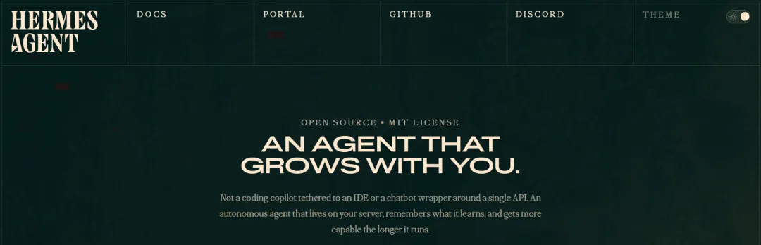 Hermes Agent由Nous Research团队开发,核心口号是“the agent that grows with you”——一个会跟着你成长的AI智能体。