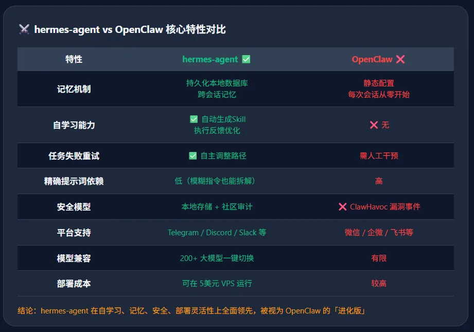 有社区观察者指出,从OpenClaw到hermes-agent的迁移潮,本质上反映的是开发者对AI Agent的认知升级:不再满足于“能做什么”,而是追问“能不能越用越强”。当一个Agent每次对话都要重新认识你,它本质上还是个工具;当一个Agent能从失败里学到东西、能记住教训,它才配得上“搭档”这个词。