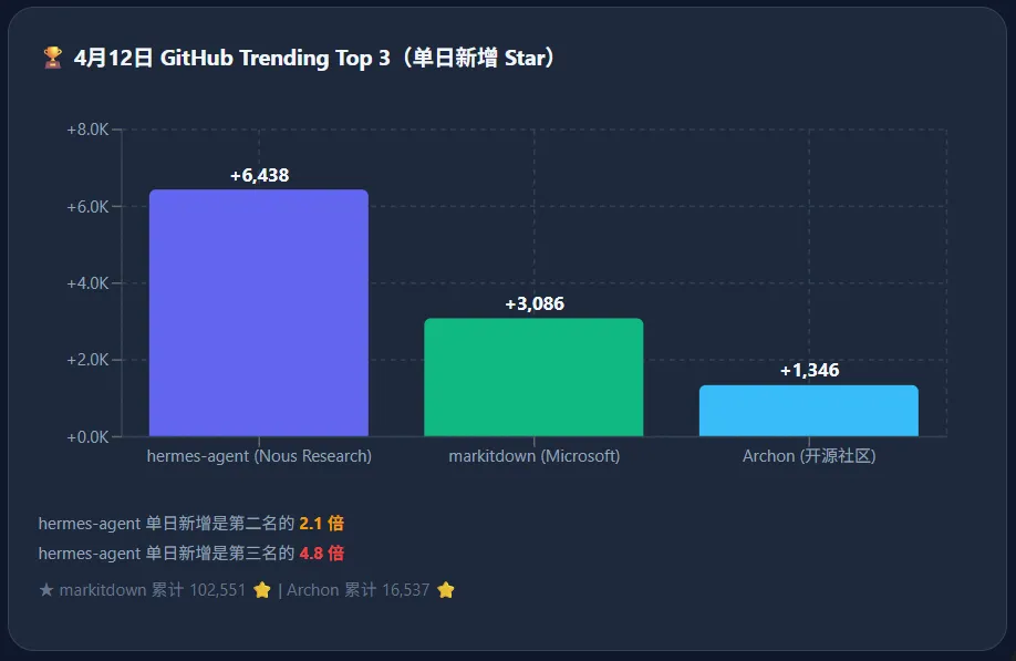 对比一下去年同期OpenClaw刚刚崛起时的数据,这种爆发速度简直是按下了快进键。而更值得关注的是榜单的集体动向:hermes-agent、markitdown、Archon三驾马车同时霸榜前三,AI Agent赛道的热度已经不只是“升温”,而是到了“沸腾”的程度。