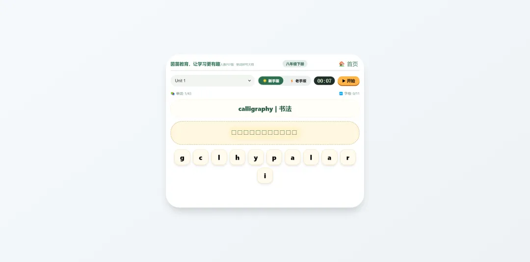 最新人教版八年级下册英语单词拼写训练,下载即用茵苗教育专为八年级孩子打造的「单词拼写大师」来啦!完全免费,无需下载,手机、平板、电脑都能用。如何免费使用「单词拼写大师」?无需下载,无需注册,打开浏览器就能玩!��八年级下册专用入口:茵苗教育人教版八年级下册英语单词拼写.html下载后转发给自己手机微信文件传输助手,用浏览器打开即可文档下载:人教版八年级下册英语单词.pdf人教版八年级下册英语单词(中译英).pdf人教版八年级下册英语单词(英译中).pdf不会用就加群问我每天坚持陪孩子学习十分钟,影响孩子的一生。