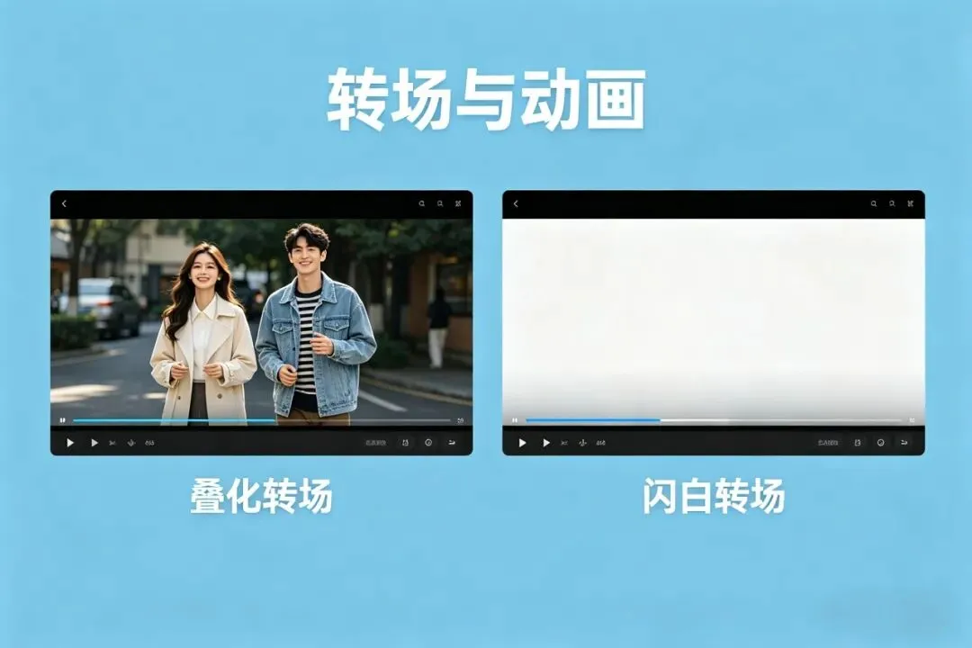 新手最容易犯的错:每个片段都加炫酷转场。其实视频转场,用「叠化」「闪白」「推近」就足够,自然不突兀;