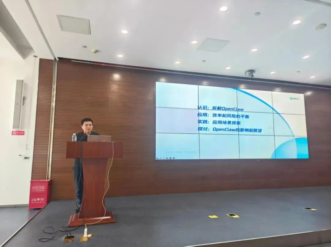随后,腾讯公司技术专家沙硕以“OpenClaw:大模型时代下的智能协作框架”为主题,系统拆解了AIAgent(龙虾)的技术架构与核心能力,通过“大模型为马、Agent框架为鞍缰”的生动类比,阐释了智能助手从静态问答到自主规划执行的能力演进,介绍了任务规划、技能复用等关键技术机制。同时,针对企业应用的安全痛点,专家详解了AI应用的安全风险与合规管控方案,介绍了腾讯SkillHub审核、云端沙箱隔离等安全保障机制。在产品演示环节,专家现场展示了腾讯自研产品WorkBuddy的落地实践,通过自动化文档处理、PPT生成、政策调研等场景的实操演示,直观呈现了产品在办公提效、金融业务场景中的赋能价值。