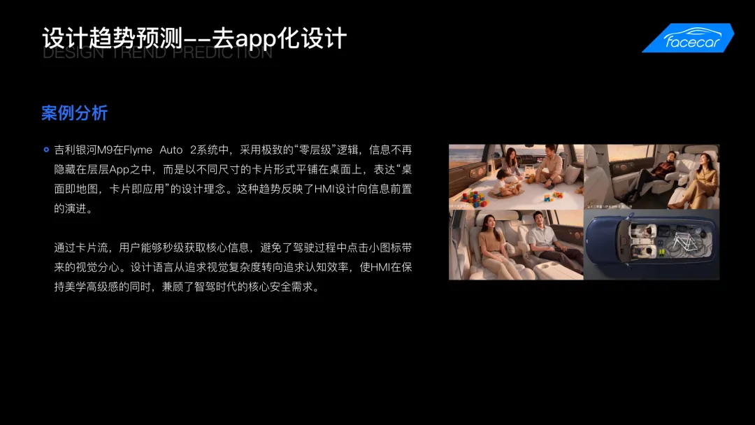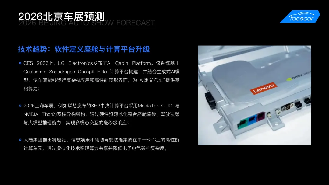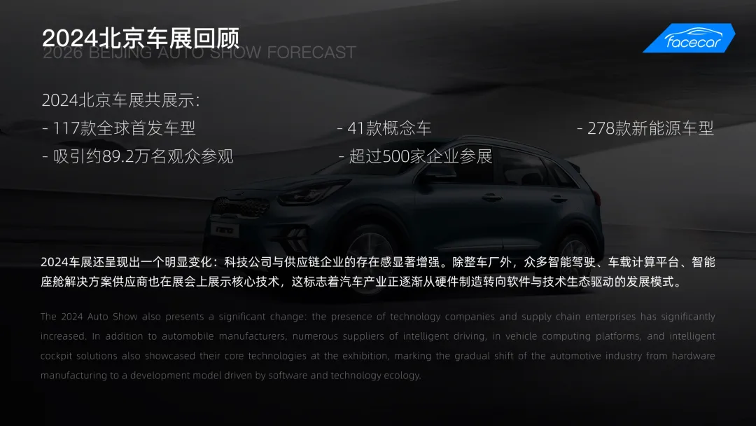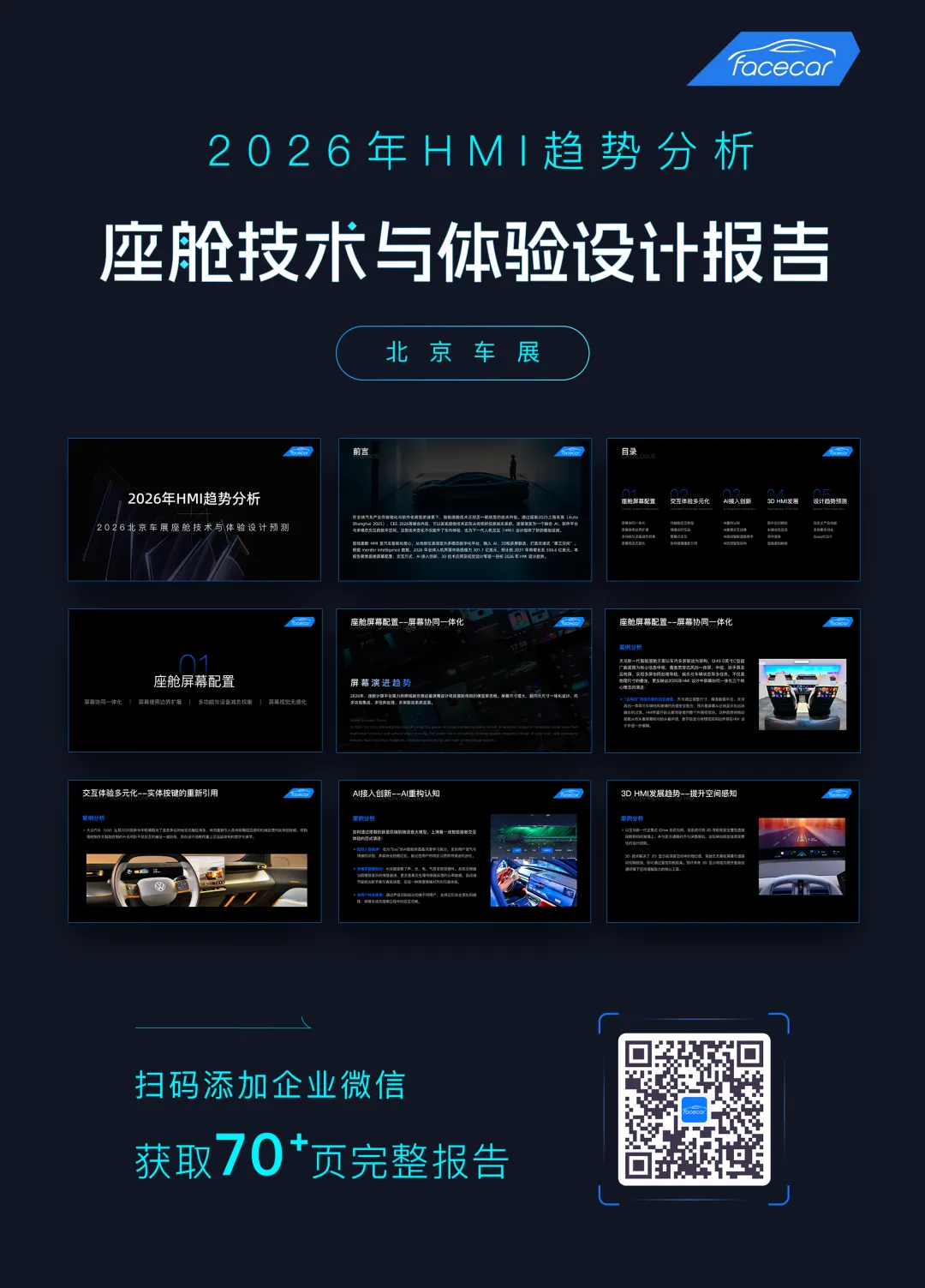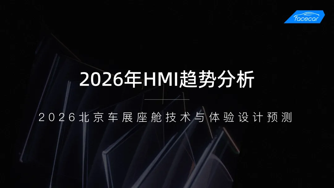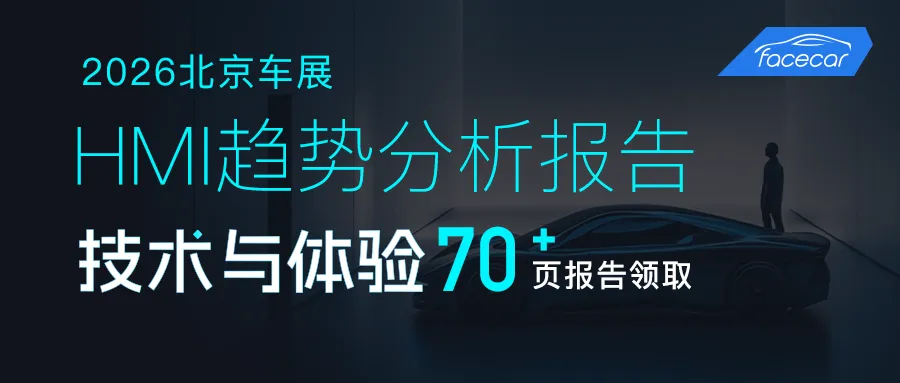 报告下载 | 2026 HMI 趋势分析及北京车展技术、体验预测作为全球最具影响力的汽车展会之一,北京国际汽车展览会(以下简称北京车展)每两年举办一次,是全球汽车产业展示新技术、新产品与未来趋势的重要舞台。结合2025年上海车展的智能化风向与2026年CES展的前沿技术,facecar基于当前座舱领域的核心升级:AI接入、3D HMI演进及智能表面材料应用等,深入行业前沿技术演进与趋势研究。facecar从座舱屏幕配置、交互体验多元化、AI接入创新、3D HMI发展、设计趋势预测等方向总结了2026年HMI的整体发展趋势,并对2026北京车展的技术与体验发展方向作出了前瞻预测。本报告由facecar针对2026年北京车展,进行内容模块洞察分析,包含但不限于:热门车型案例分析创新技术发展最新设计趋势走向AI如何接入智能座舱3D应用趋势针对智能座舱HMI前瞻性设计洞察,详细解读北京车展智能座舱亮点与趋势。生成70+页完整版报告👇 以下为报告预览 👇篇幅有限扫码领取70+页完整版《2026北京车展 | HMI技术、体验趋势分析报告》👇👇👇扫描海报二维码添加facecar企业微信客服回复“北京车展“领取70+p完整版报告