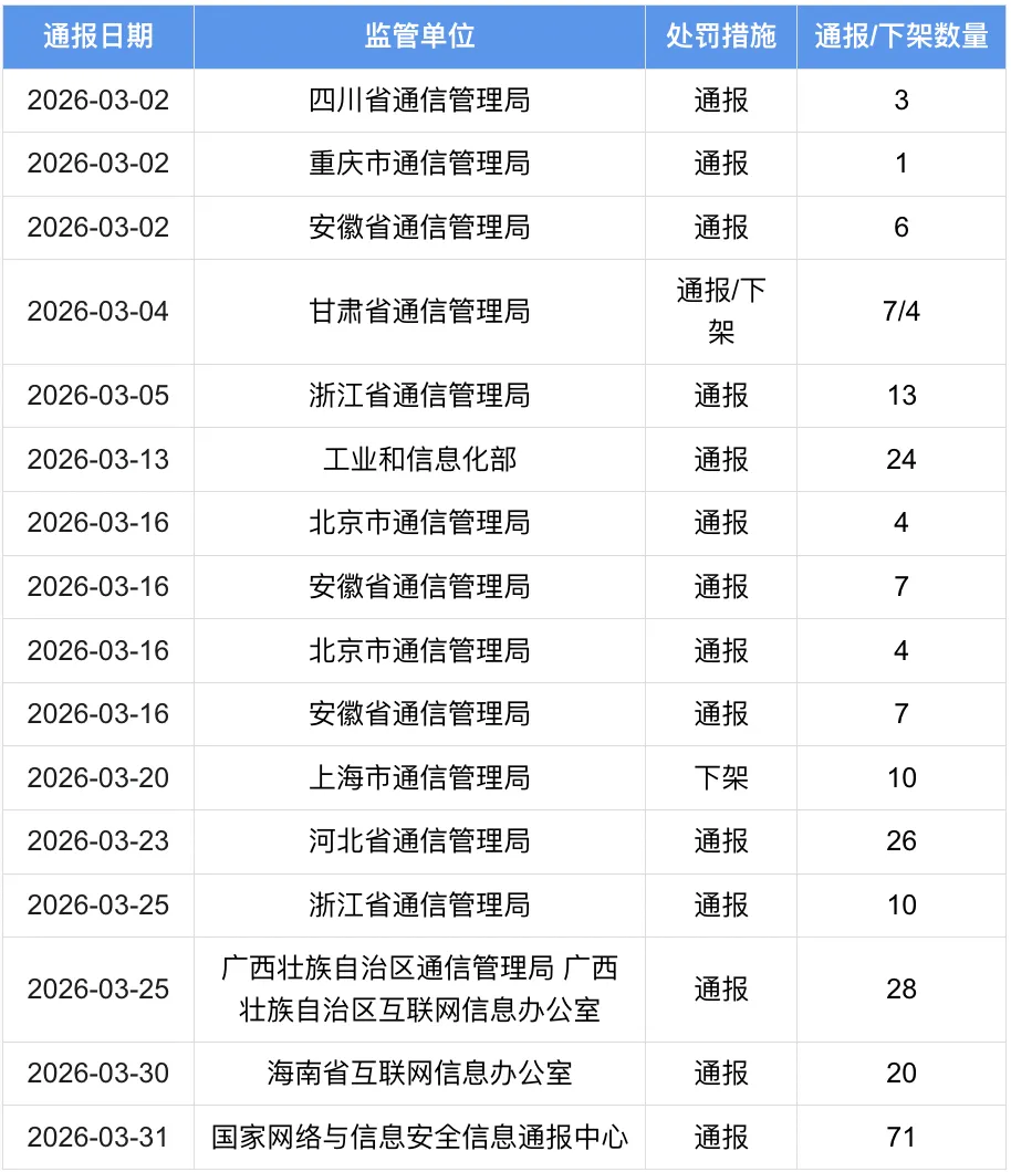 通过研究监管通报,可以了解监管机构对App的关注重点和执法尺度,从而判断自己的App是否存在类似的问题,及时进行整改。史宾格平台监控到国家网络与信息安全信息通报中心、海南省互联网信息办公室、2家地方网信及12家地方通信管理局公开通报/下架共计245款(包括Android App 193款、小程序 39款、Andoid SDK 8款、iOS App 5款),其中通报231款(包括Android App 183款、小程序 35款、Andoid SDK 8款、iOS App 5款),下架14款(包括Android App 10款、微信小程序 4款)
