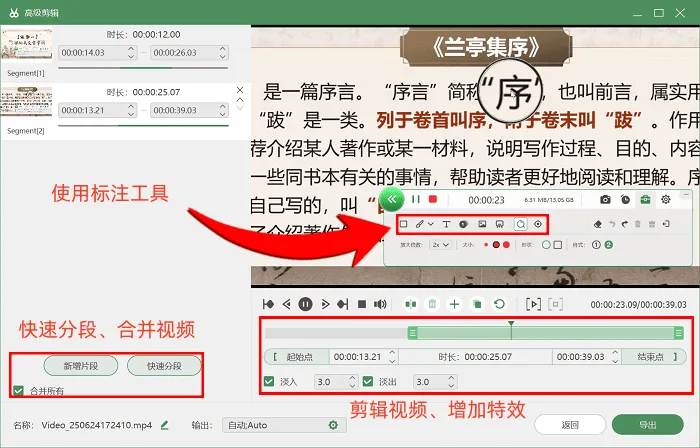 第三步:录制结束,软件会自动弹出视频预览窗口,不用手动查找文件,方便你及时查看录制效果。在预览窗口中,还能进行基础剪辑,比如把长视频分段,删掉多余片段;也能添加简单元素,让视频更清晰易懂。