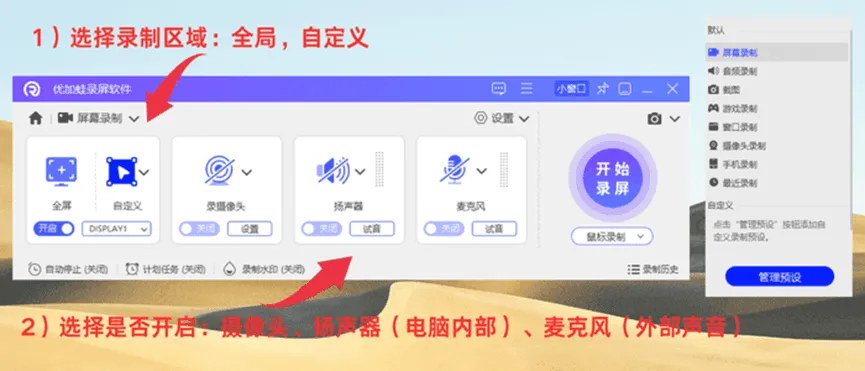 Win10录屏功能怎么打开?优加蛙录屏大师的界面简洁清爽,功能标识清晰,用户查找和使用功能都很便捷,新手也能快速熟悉录屏流程。