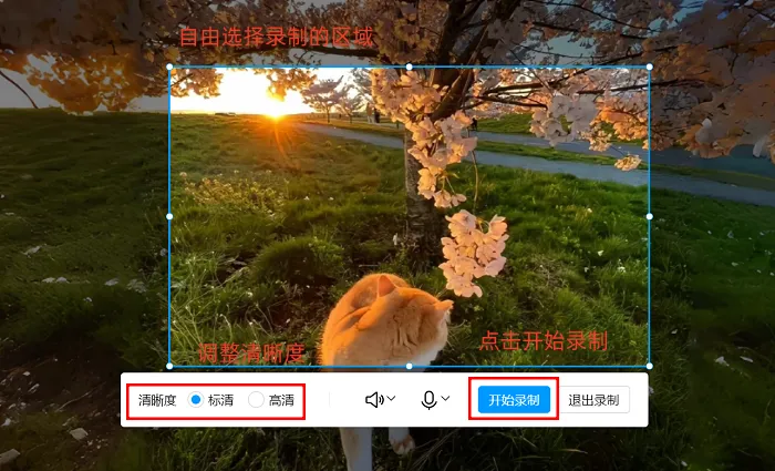 第二步:选定视频录制模式后,进入个性化定制步骤。先进行屏幕区域选择,用鼠标拖动就能精准划定录制范围,也能直接选整个桌面。接着设置音频来源,若只需录Mac屏幕里的声音,像视频背景音、软件提示音,就勾选系统音频;若要同时录麦克风声音,就同时勾选麦克风音频。还能点击设置调整音频质量。设置完成后,点击界面录制按钮,屏幕录制就正式开始了。