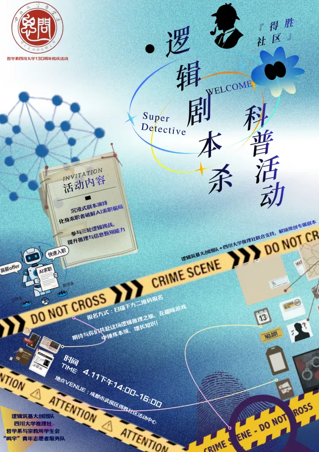 为庆祝四川大学建校130周年,面向青少年普AI时代安全防范意识与逻辑思维能力,帮助青少年识别AI新型诈骗、树立理性求职与科学思辨观念,4月11日,逻辑筑基大创团队联合四川大学推理社、四川大学哲学系与宗教所学生会“鸣宇”青年志愿者服务队,在成都市武侯区得胜社区开展“智辨AI・职路启航”青少年逻辑素养与AI反诈能力提升实景剧本杀活动。