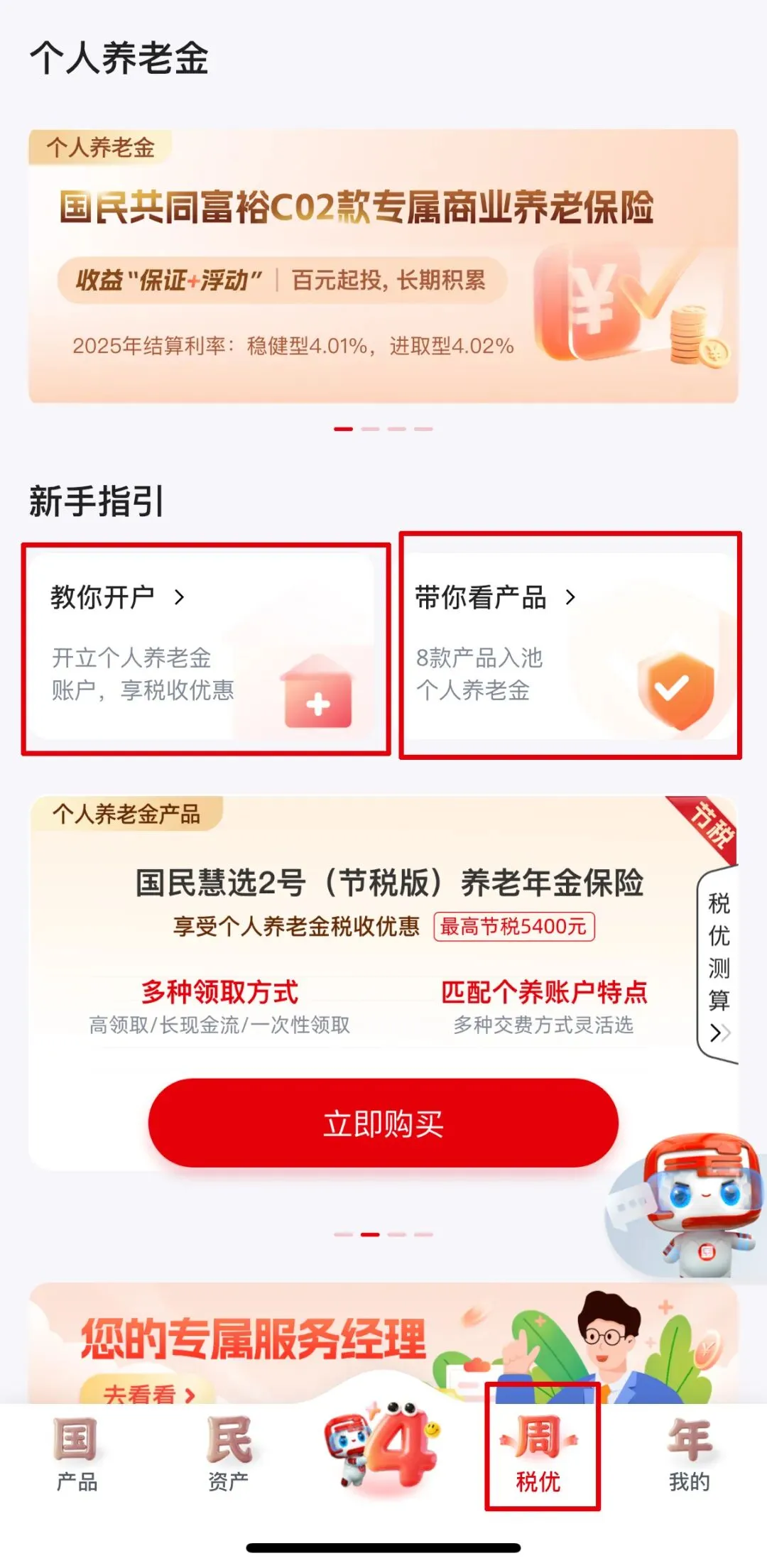 在实际操作中,从开立账户到完成缴存、再到选购产品,常常需要在不同平台之间切换。App2.0无缝对接电子社保卡,提供全流程个人养老金服务,您可以直接在App内动动手指,即可完成账户开立、缴存及产品购买,无需跳转,几步操作即可轻松享受税优。