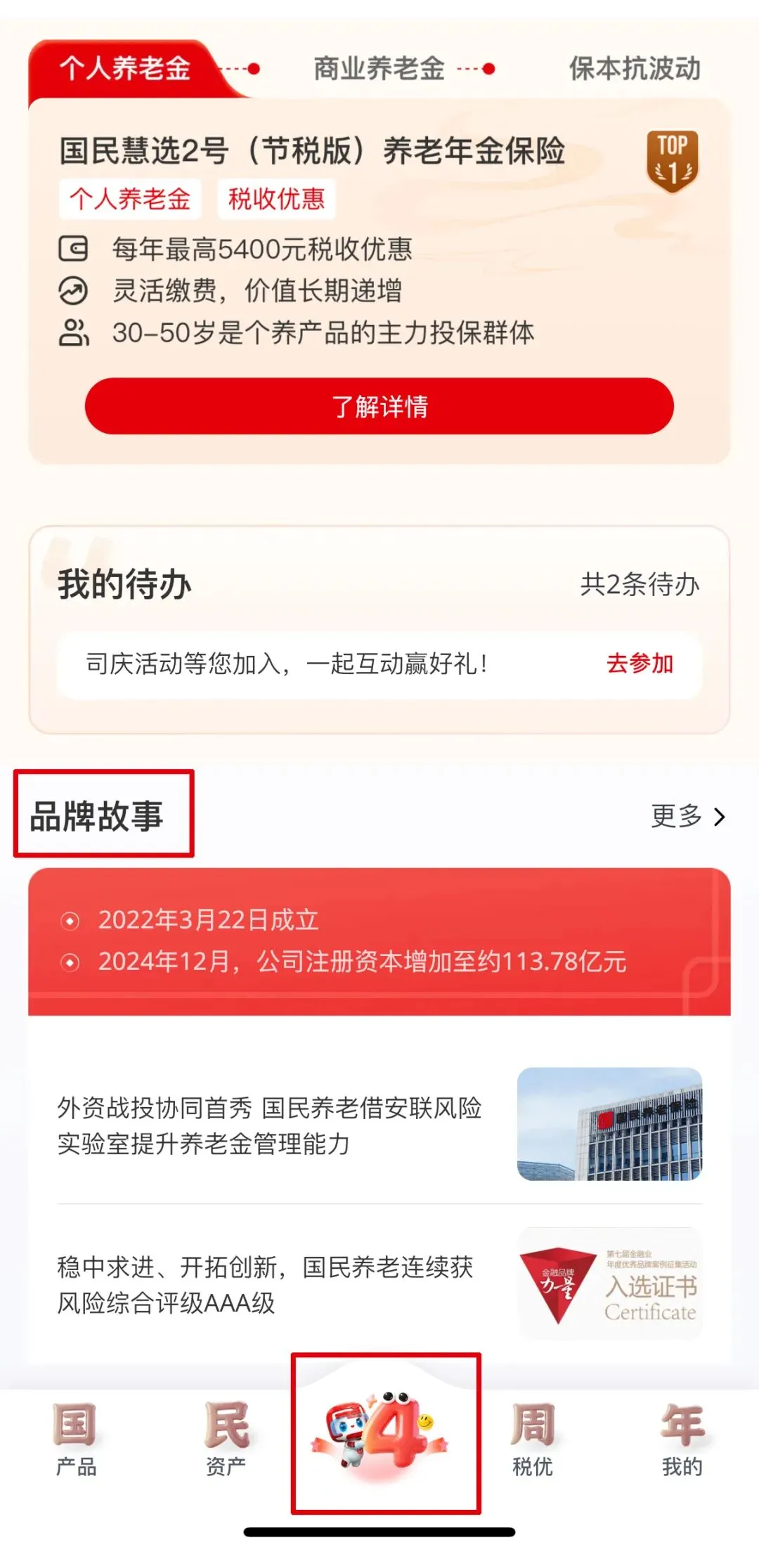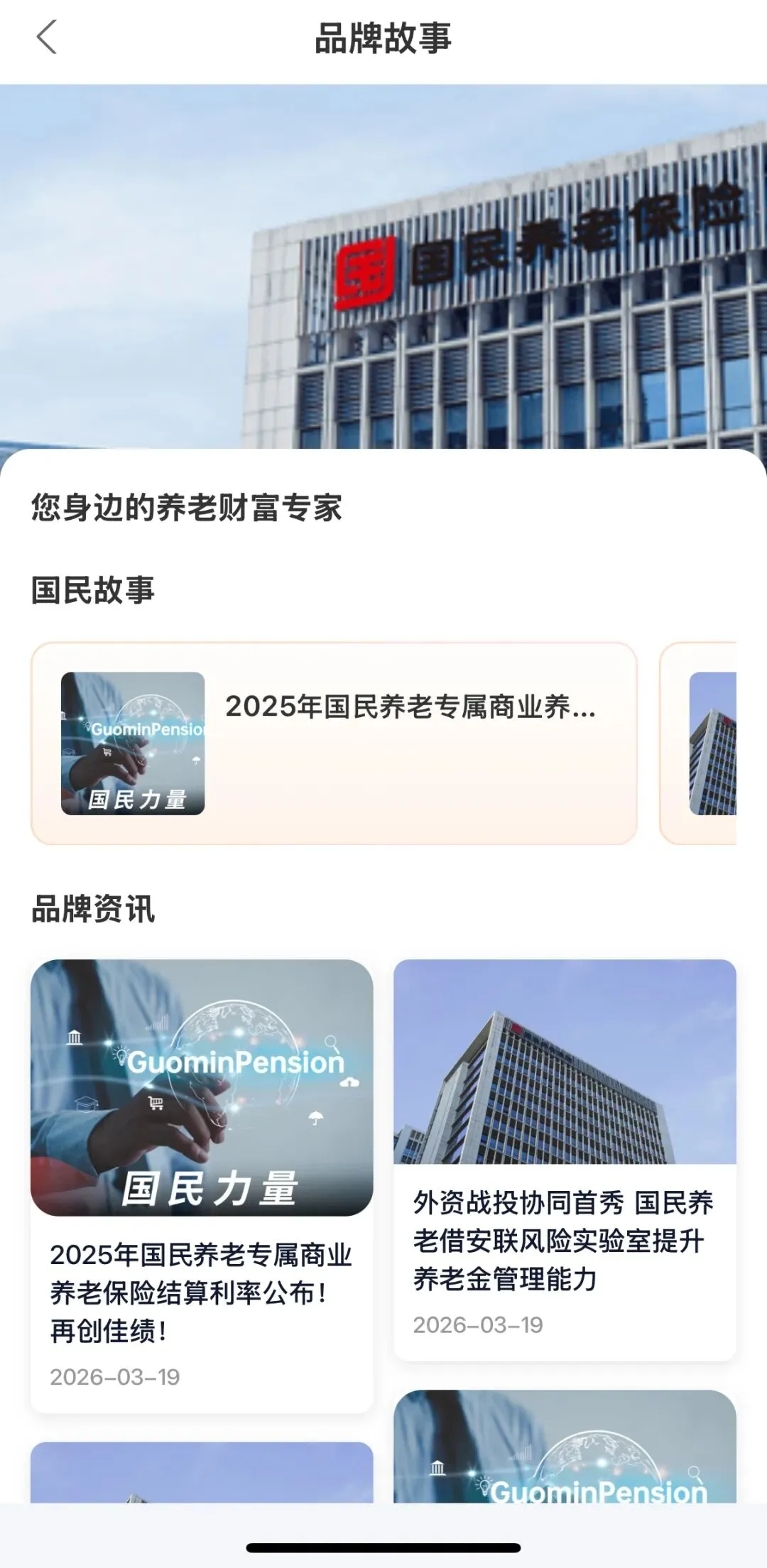 选择一家养老保险公司,了解它的背景、实力和发展历程,是建立信任的第一步。App2.0新增“品牌故事”专区,集中展示国民养老保险的发展历程、重大事件、所获荣誉、股东背景等信息。