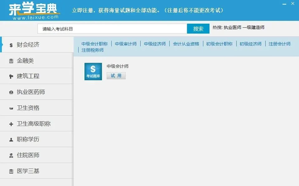 来学宝典电脑版是一款适用于各类资格考试的辅助工具类软件,你可以通过这款软件学习公务员、外语、财会、建筑等等一系列的资格考试,软件收录的题型在行业内具有绝对的权威性,紧扣考试大纲,与国家规定大纲保持同步,让用户能够在最短的时间内掌握重点难点。 来学宝典电脑版对常考题、易错题进行重点分析讲解,软件还收录于考题题型一致的高仿真模拟试题,方便考生在学习之后巩固自身以及测验。海量的题库加上众多练习,让我们的考生能够很好的完成学习,如果你想要通过资格考试获得资格证书,那么这款软件是非常不错的学习选择。