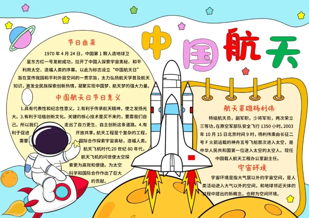 彩色卡通手绘中国航天日小报手抄报小学生手抄报